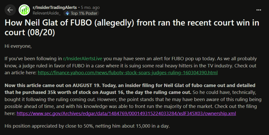 Want proof? Here’s the post: https://www.reddit.com/r/InsiderTradingAlerts/comments/1exabfg/how_neil_glat_of_fubo_allegedly_front_ran_the/?share_id=SaOvf0GKGPxlv8SETcU8F&utm_name=ioscss